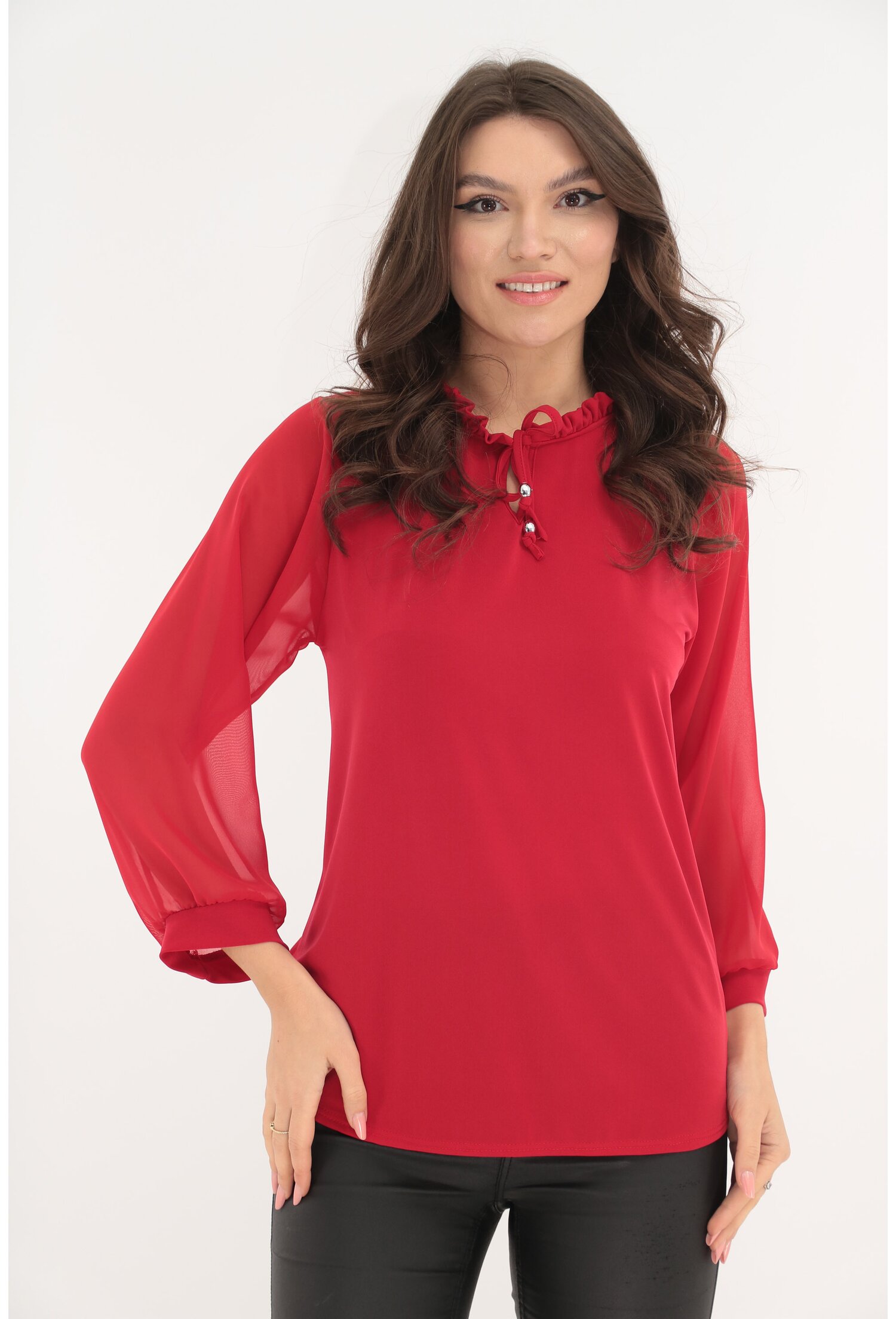 Bluza roșie cu guler încrețit 70% Vască, 30% Poliester Încrețit 150 lei 46, 48, 50, 52