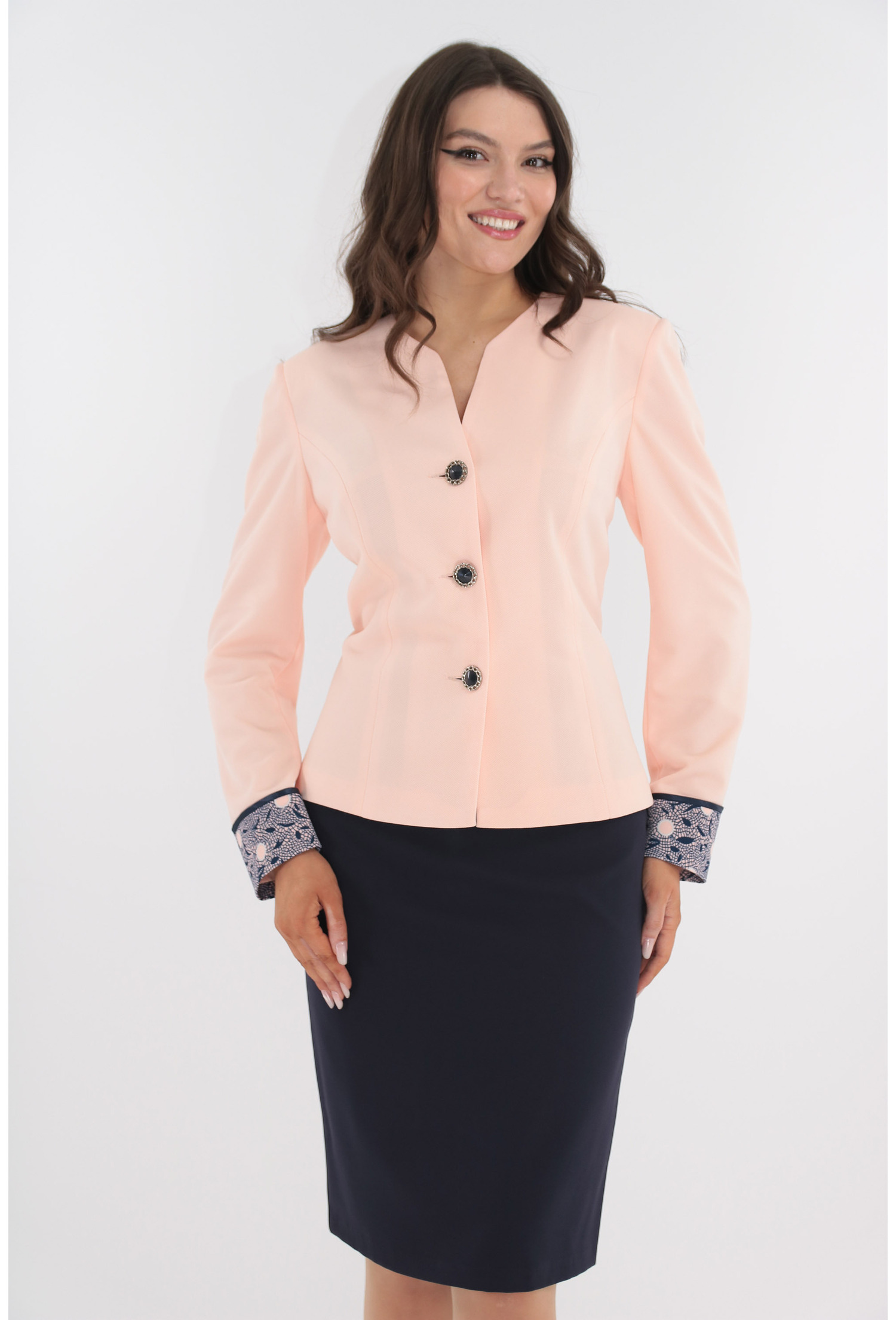 În căutarea unui costum care să îmbine eleganța, confortul și stilul? Avem pentru tine soluția ideală! Costumul compus dintr-un sacou roz și o fustă conică bleumarin este alegerea perfectă pentru orice femeie care vrea să strălucească. Fie că este vorba de un eveniment formal sau o întâlnire de afaceri, acest costum te va scoate în evidență.