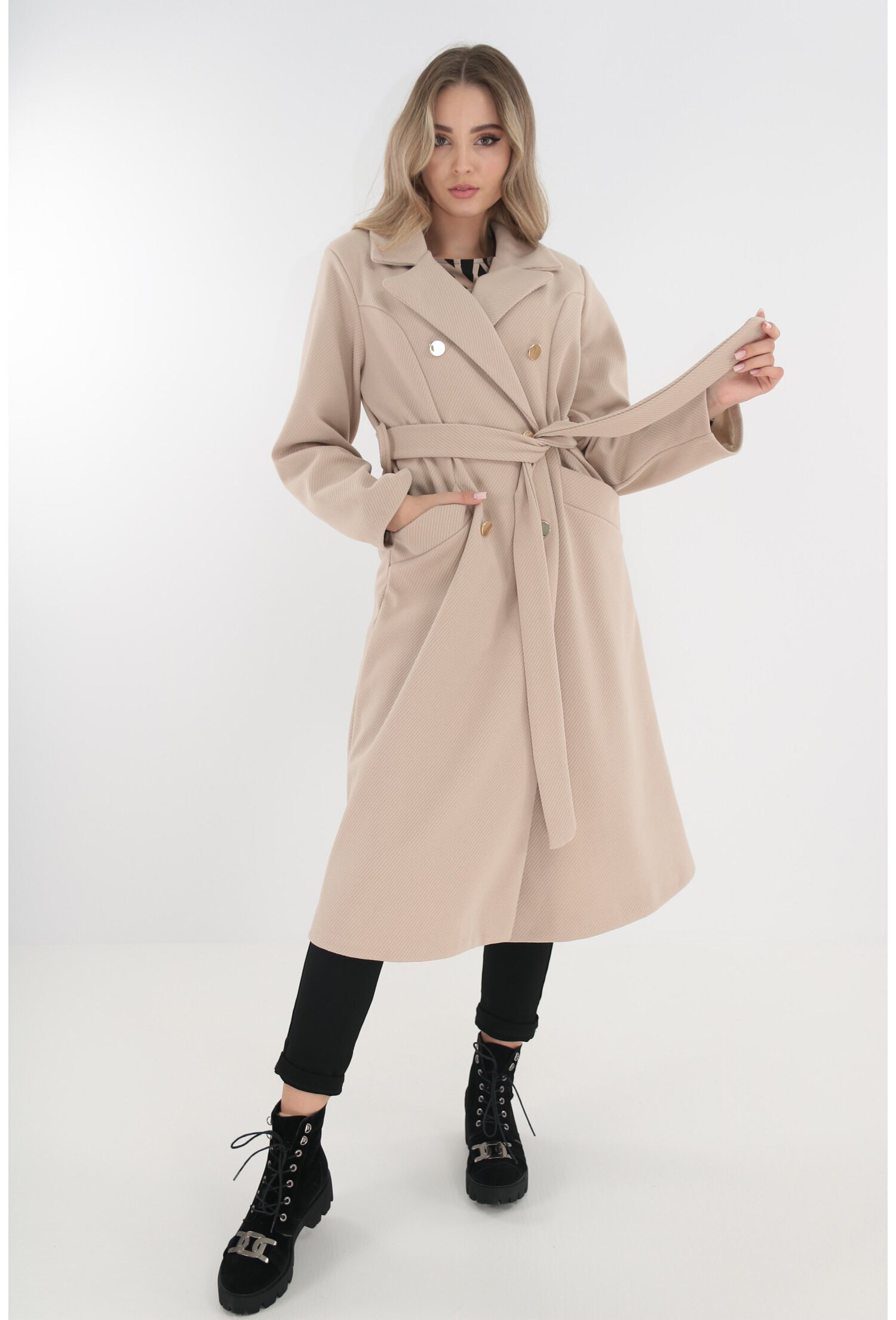 Palton din stofă crem cu nasturi aurii și cordon talie