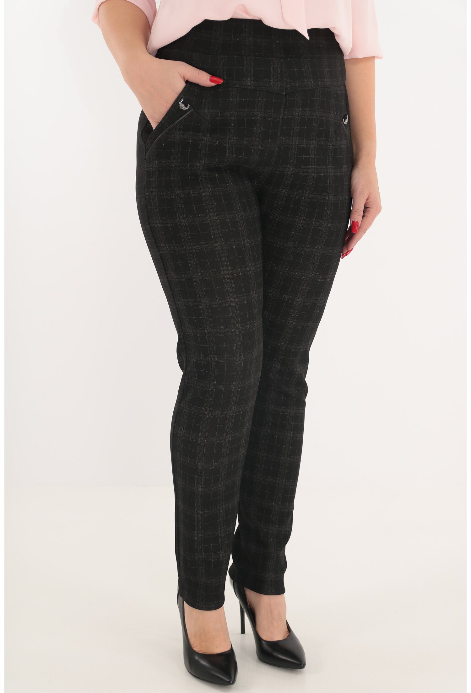3. Stil: Modelul discret în carouri și glitter face ca acești pantaloni să fie o alegere rafinată pentru orice ocazie.