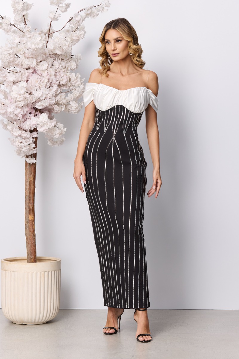 Cu un design ce urmareste linia corpului, rochia lunga neagra cu strass-uri va accentua frumusetea formelor tale, punandu-ti silueta in evidenta. Modelul pe corp este perfect pentru a crea o tinuta in tendintele sezonului, iar croiala impecabila a acestei rochii va atrage toate privirile.