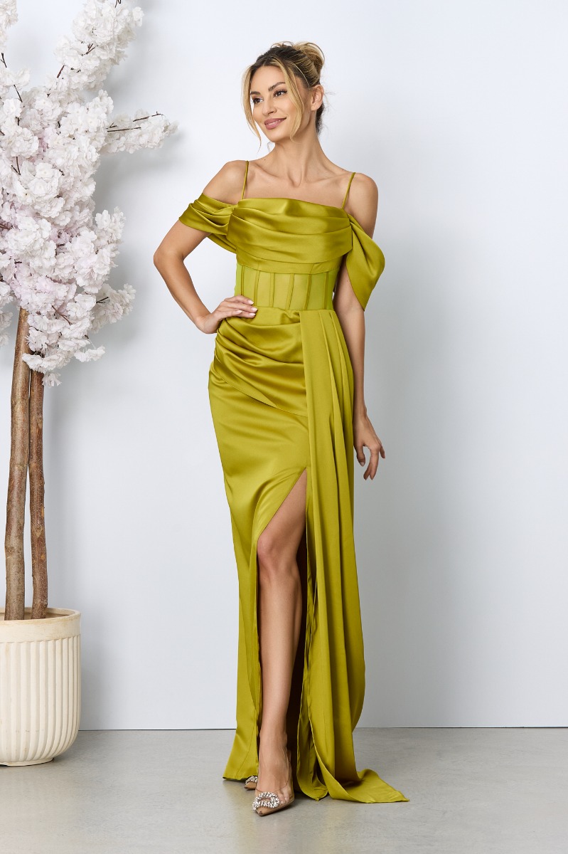 Rochia lunga de ocazie fistic din satin se remarcă prin bustul bine structurat de tip corset, care îți va evidenția frumusețea naturală, iar bretelele subțiri adaugă un aer feminin și delicat întregii ținute. Manecile scurte lăsate pe umeri conferă un aer romantic și sofisticat, iar crepeul pe un picior aduce un element de senzualitate. Cu o croială impecabilă și finisaje de cea mai bună calitate, această rochie este alegerea perfectă pentru orice eveniment deosebit.