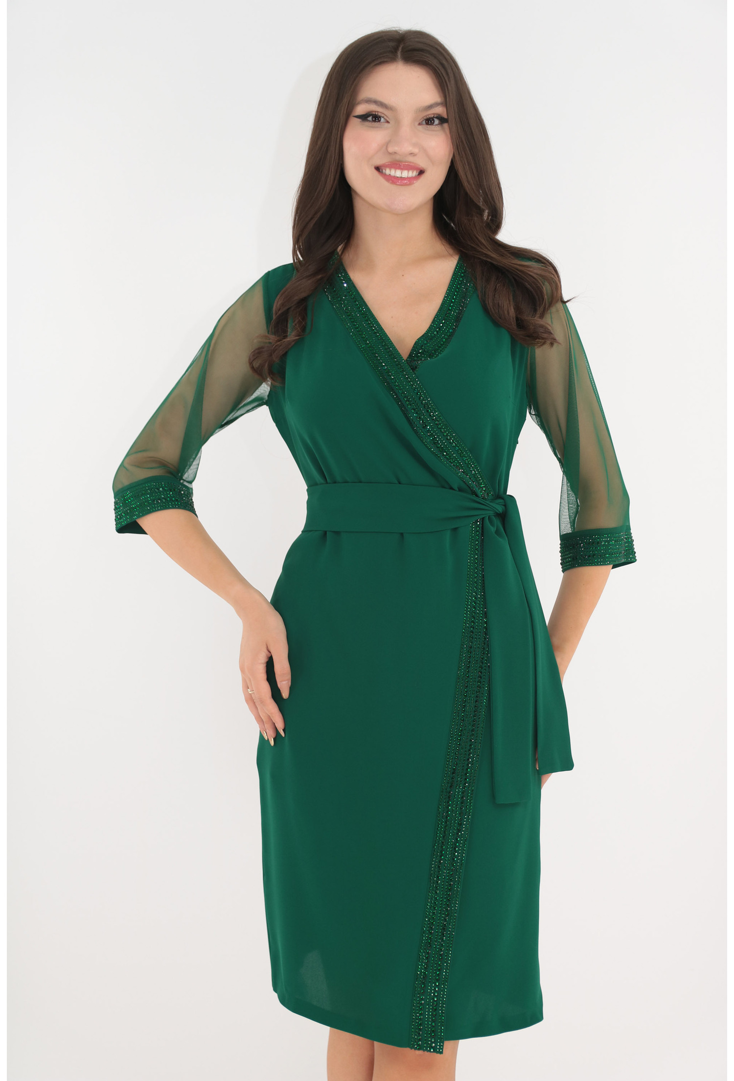 Rochie verde din lurex cu fronseuri si decolteu parte peste parte