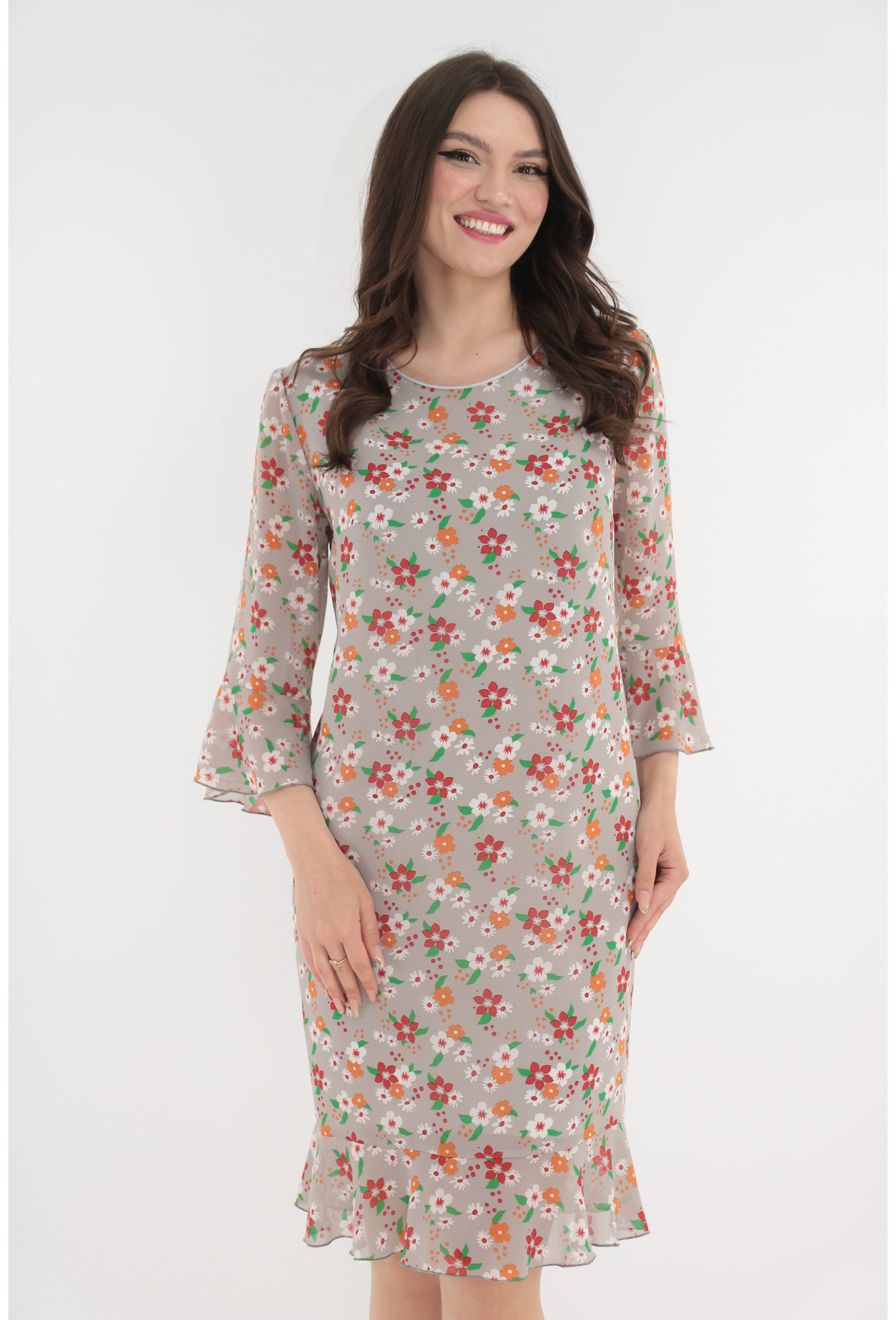 Rochia din voal gri se caracterizează printr-o croială dreaptă, decolteu rotund, mâneci scurte cu volanase, și flori albe și roșii ce adaugă o notă de eleganță.