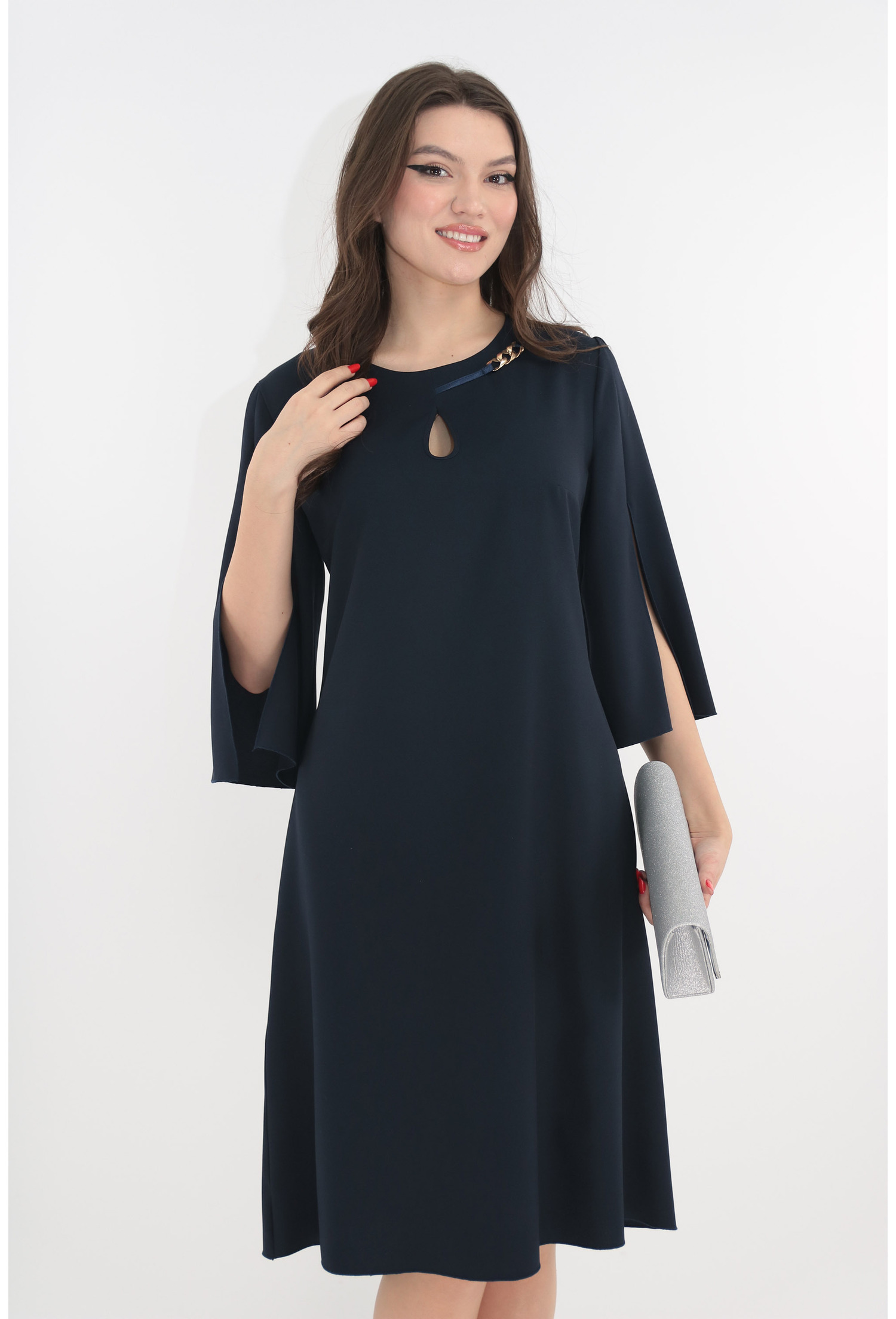 Rochie evazată bleumarin cu decupaj și accesoriu auriu la decolteu