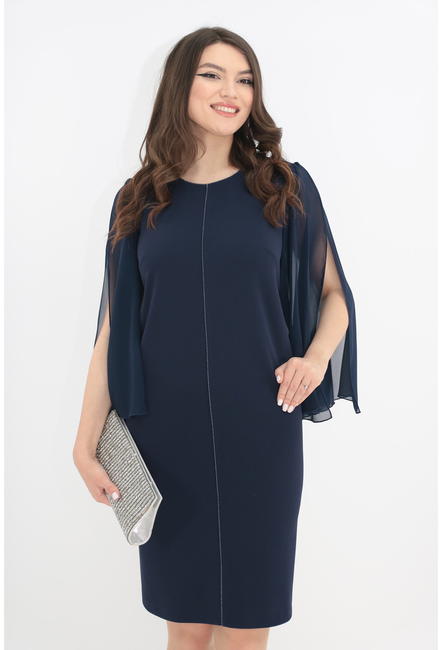 - Stil: Combinația de bleumarin cu detalii argintii oferă un aer sofisticat, iar mânecile din voal adaugă o notă de romantism.