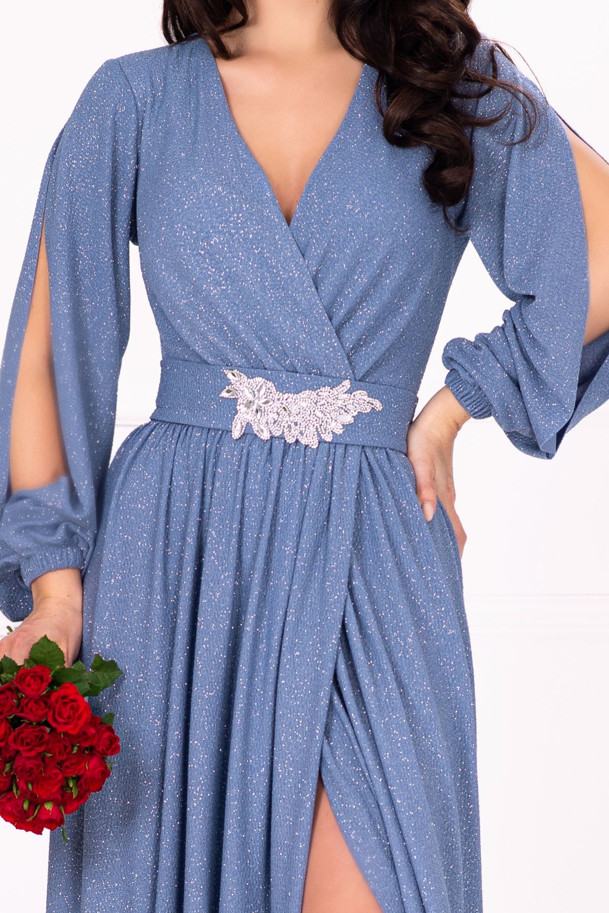 Unicitatea rochiei Chantal provine nu doar din sclipiciul sau stralucitor, ci si din design-ul sau modern. Decolteul in V petrecut adauga un aer de eleganta, iar mânecile lungi cu decupaj aduc un strop de originalitate. Fermoarul de la spate asigura o inchidere sigura, iar crapatura pe picior ofera o nota de senzualitate, facand-o sa fie nu doar o rochie, ci o experienta de purtare.