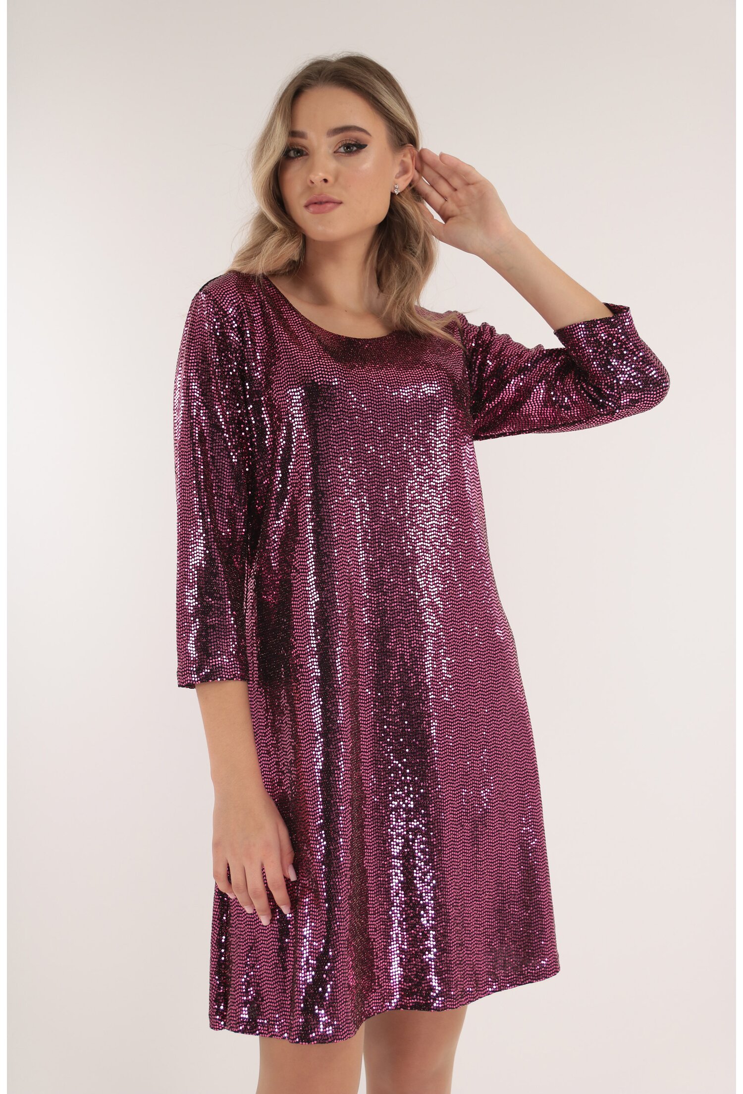Fabricată dintr-o țesătură fină elastică, rochia se prezintă într-o nuanță vibrantă de fucsia, cu aplicații strălucitoare care îți vor capta privirile. Croiala lejeră permite o mișcare comodă, iar decolteul rotund îți evidențiază delicatețea gâtului. Ce-i mai tare? Are anchiore la spate cu un element decorativ metalic, sporind astfel atractivitatea rochiei.