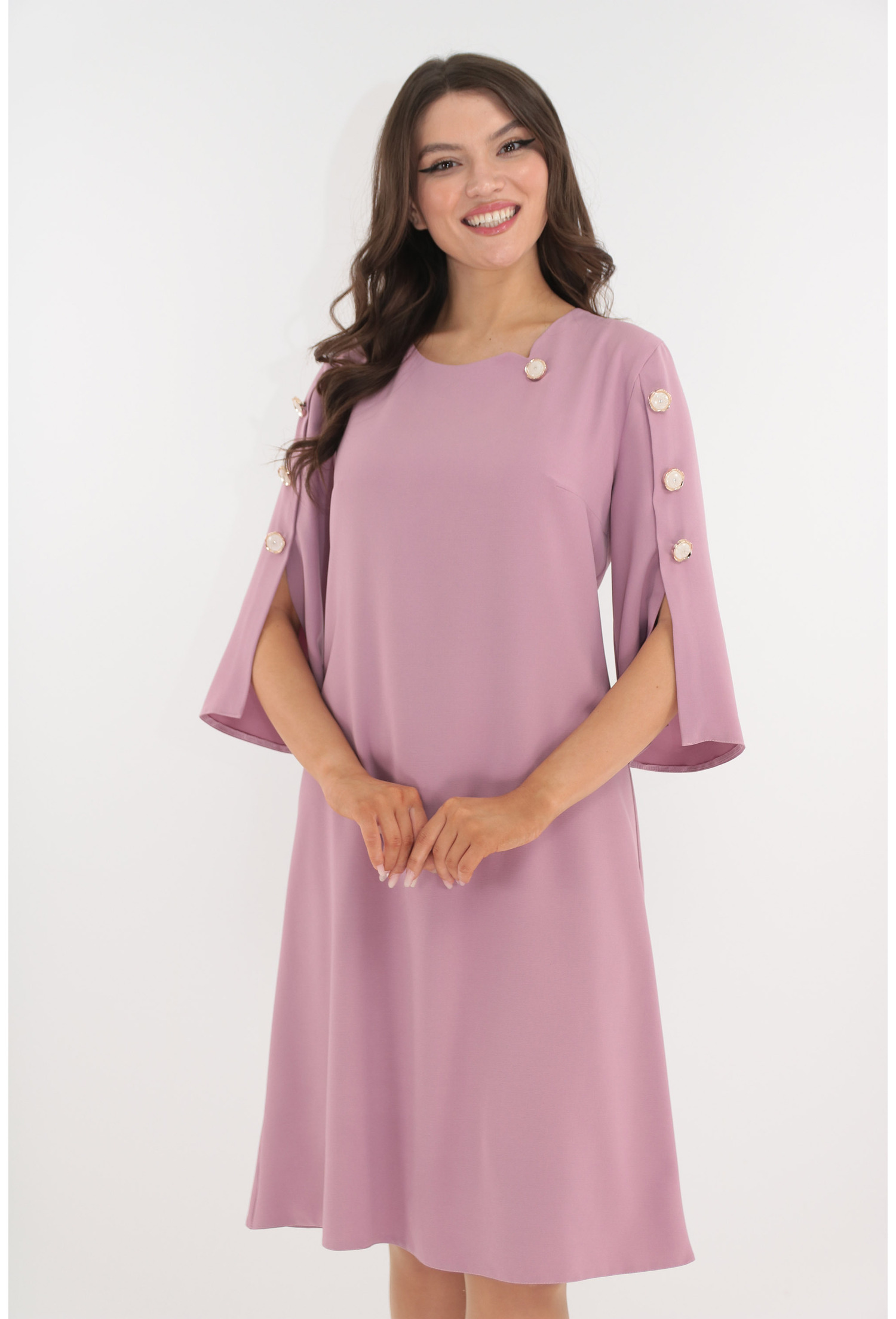 - Maneci evazate 3/4, împodobite cu nasturi decorativi pentru un aspect chic.