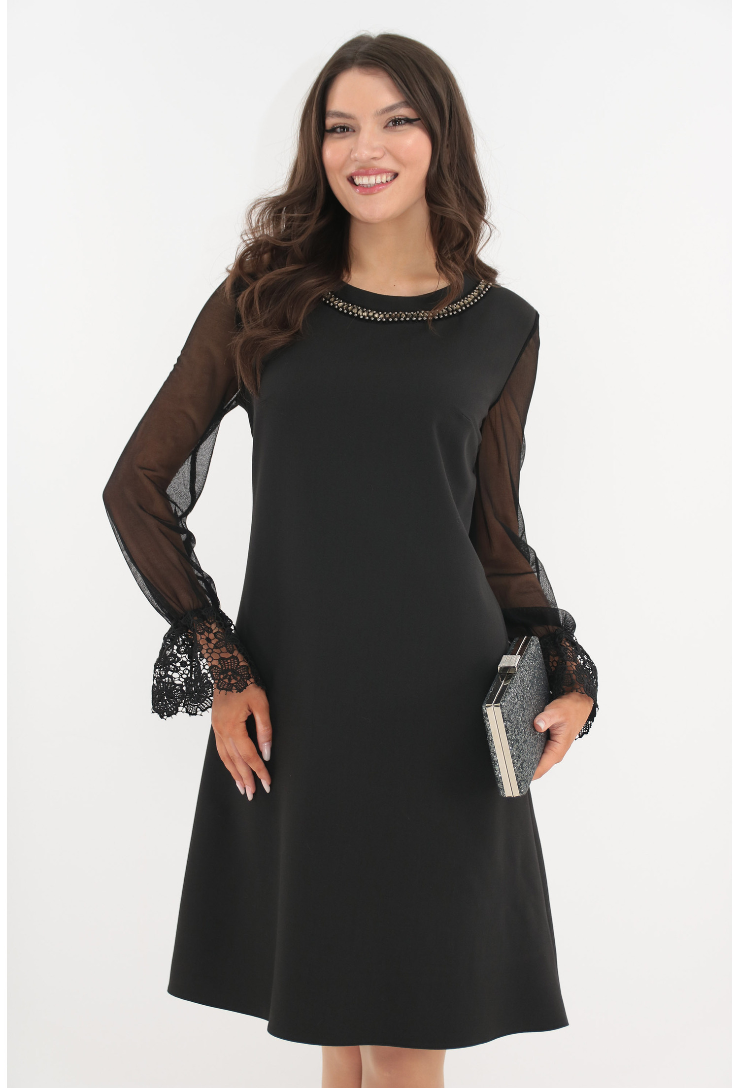 Rochie eleganta clos din voal negru accesorizat cu margele si strasuri